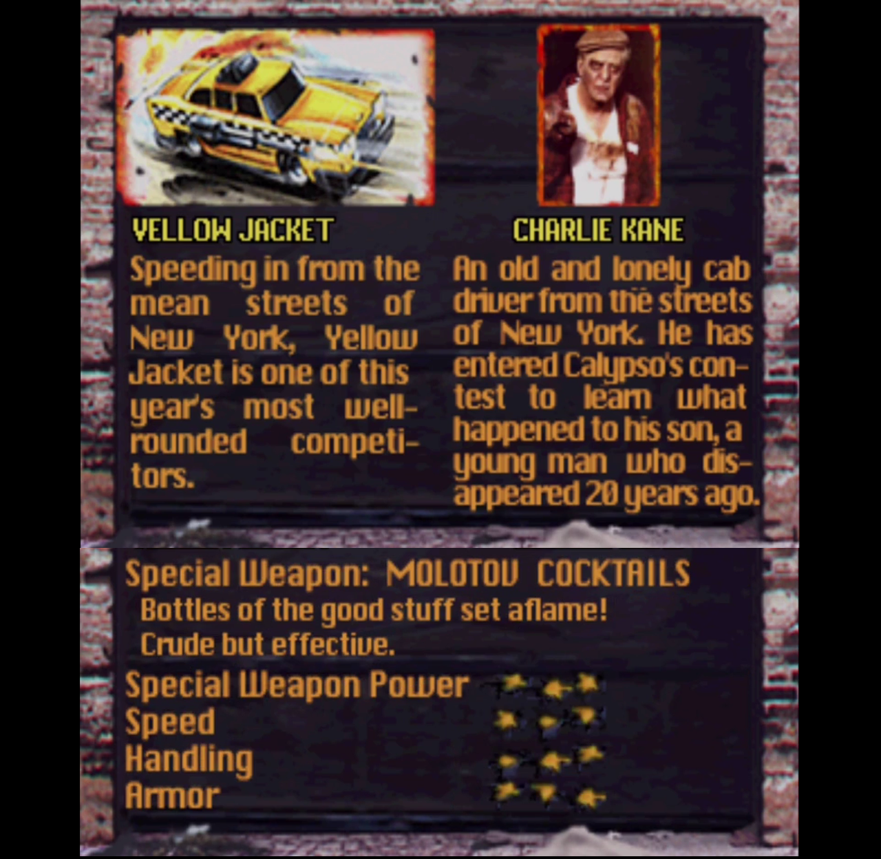 Yellow Jacket is an average car in terms of armor, speed and damage from the special weapon, however it has two great advantages, the first would be the car's steering, just like a taxi driver, the player will be able to control the direction of the vehicle with a mastery that will help you to dodge and dribble around the other vehicles in the game, this makes it easy to use the reverse strategy, which is great for causing damage and dodging attacks even when facing the final boss. The second big advantage would be the replacement of the special weapon, you can use up to five in a row , and replenishes itself in approximately 10 or 12 seconds, an advantage that no other vehicle has in the game, the strategy of cornering and shooting at the enemy will work very well.